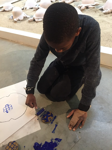 Puis ce fut leur tour de suivre les traces de Rachid KHIMOUNE, en allant dehors, dans la rue, à la recherche de bouches d'égouts et autres plaques habituées à être foulées. Ils en ont fait une empreinte à l'aide d'argile pour ensuite la peindre et la reproduire sur un dessin de carapace de tortue comme ils ont pu l'observer dans l'exposition.